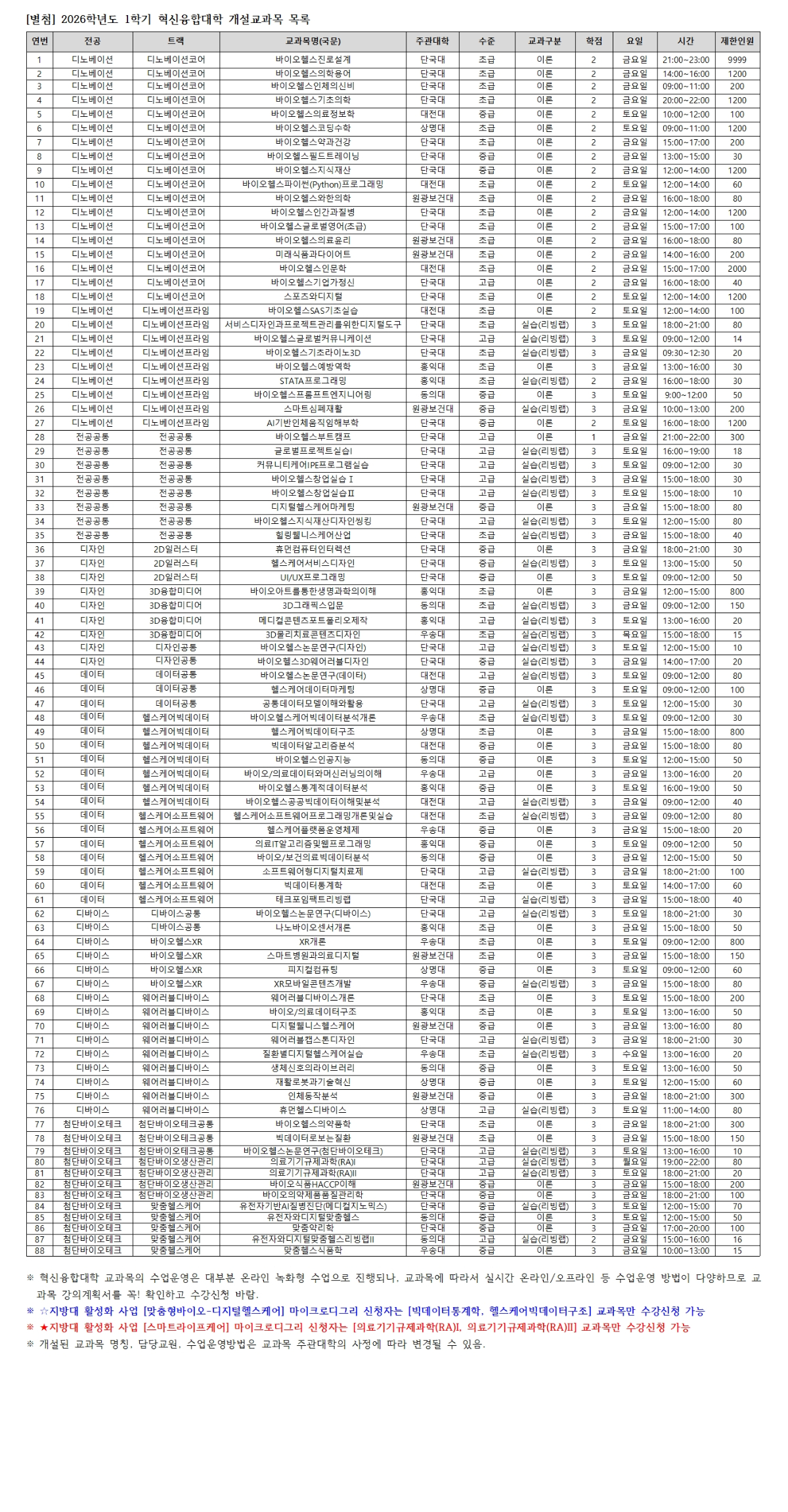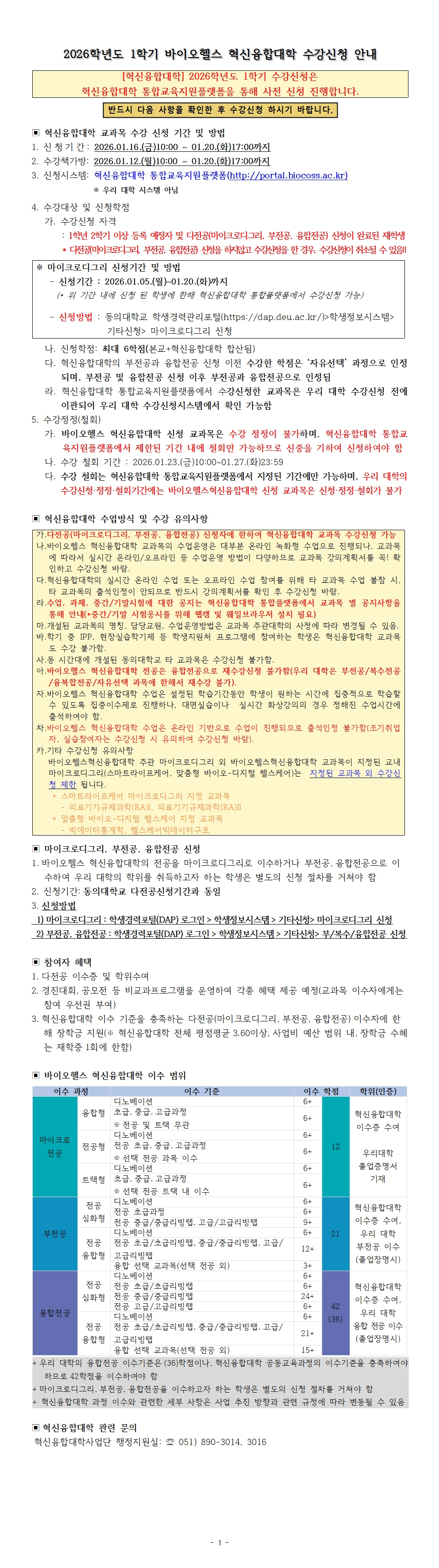 2026-1학기 바이오헬스 혁신융합대학 수강신청 안내