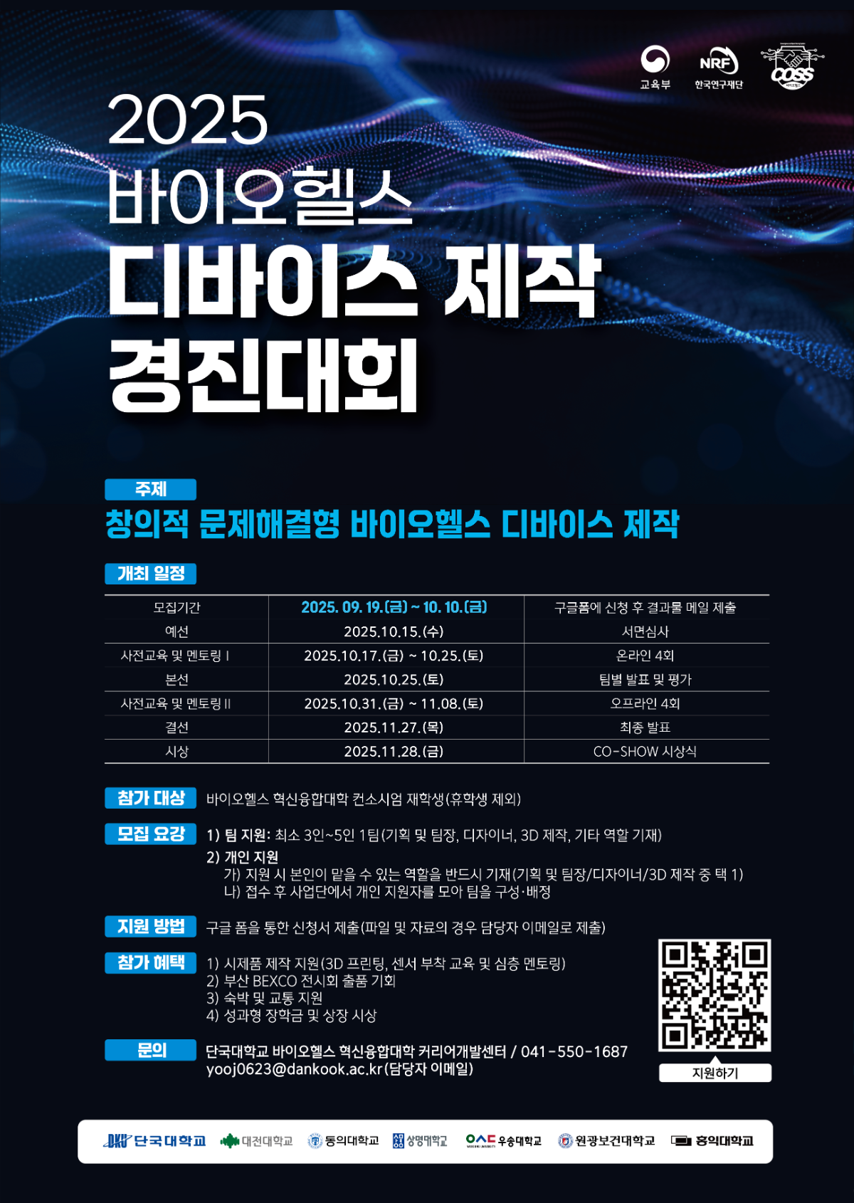 '창의적 문재해결형 바이오헬스 디바이스 제작'을 주제로 2025 바이오헬스 디바이스 제작 경진대회를 개최하오니 학생들의 많은 관심과 참여부탁드립니다😎