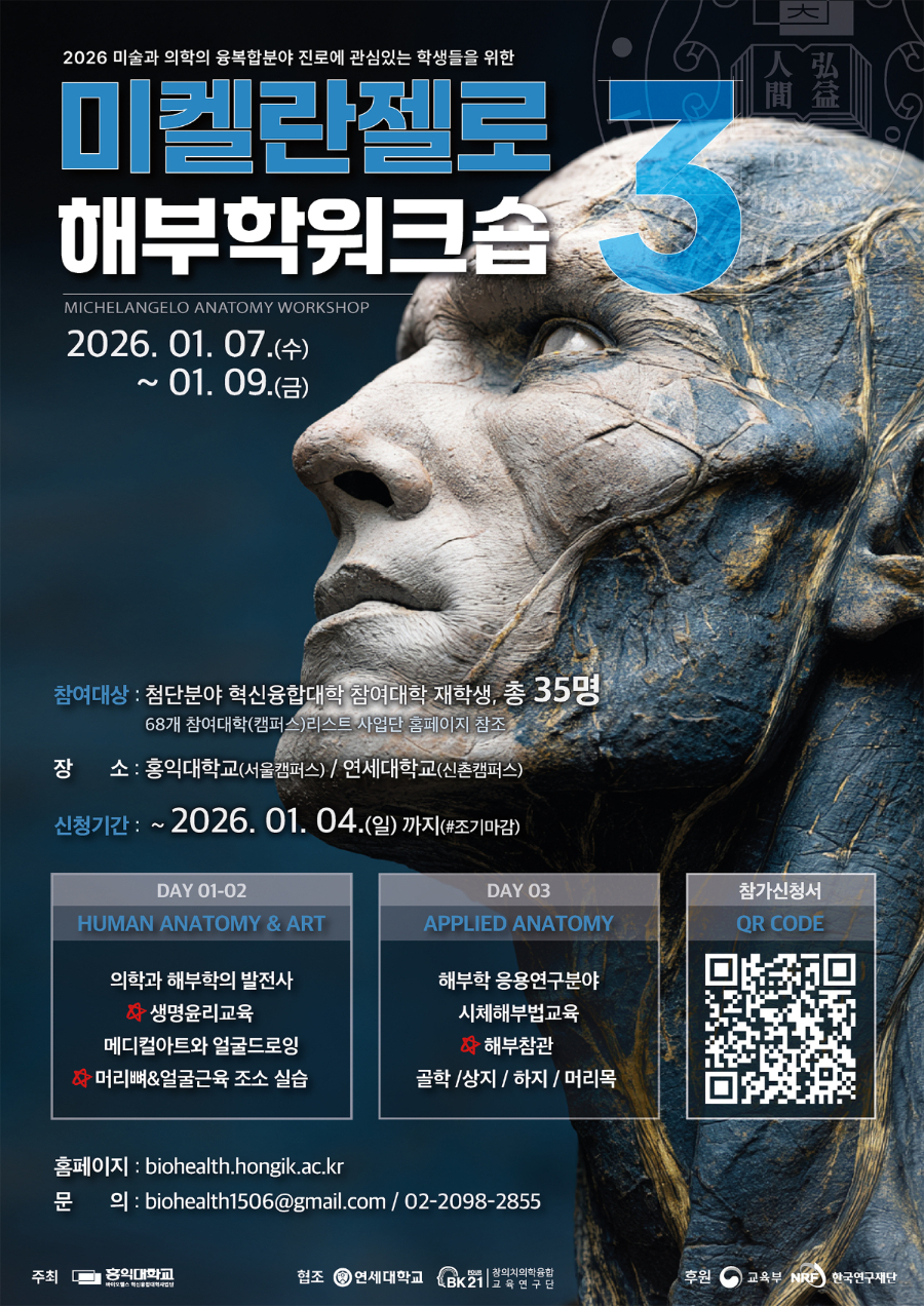 홍익대학교 바이오헬스 혁신융합대학사업단에서 '제 3회 미켈란젤로 해부학워크숍'을 진행하오니 많은 관심과 참여바랍니다.