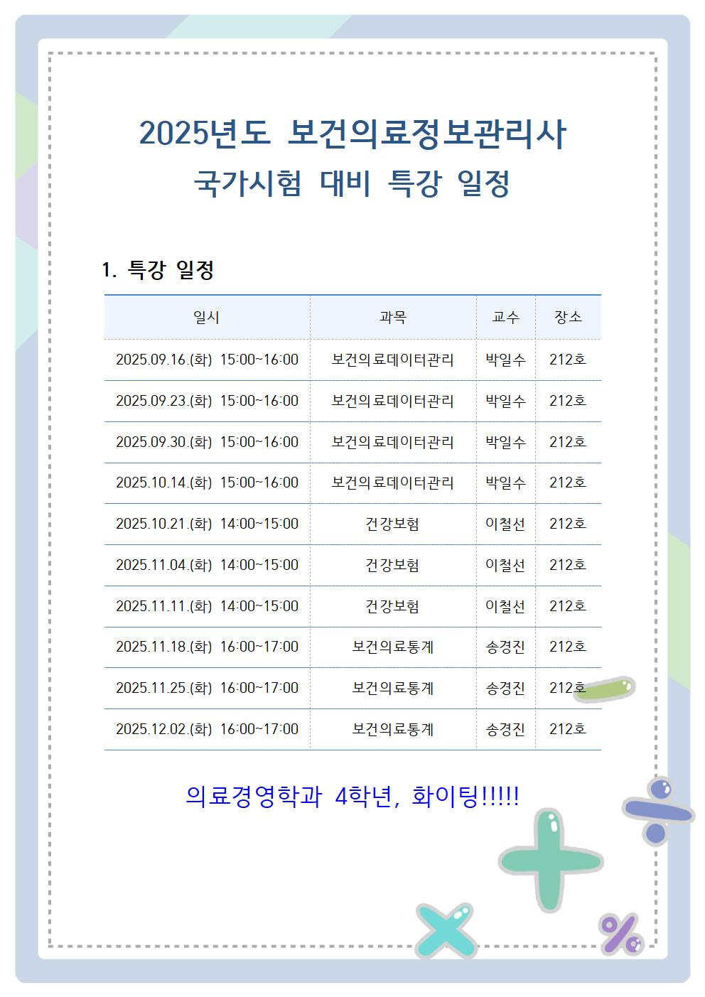 2025학년도 보건의료정보관리사 국가시험 대비 특강 일정