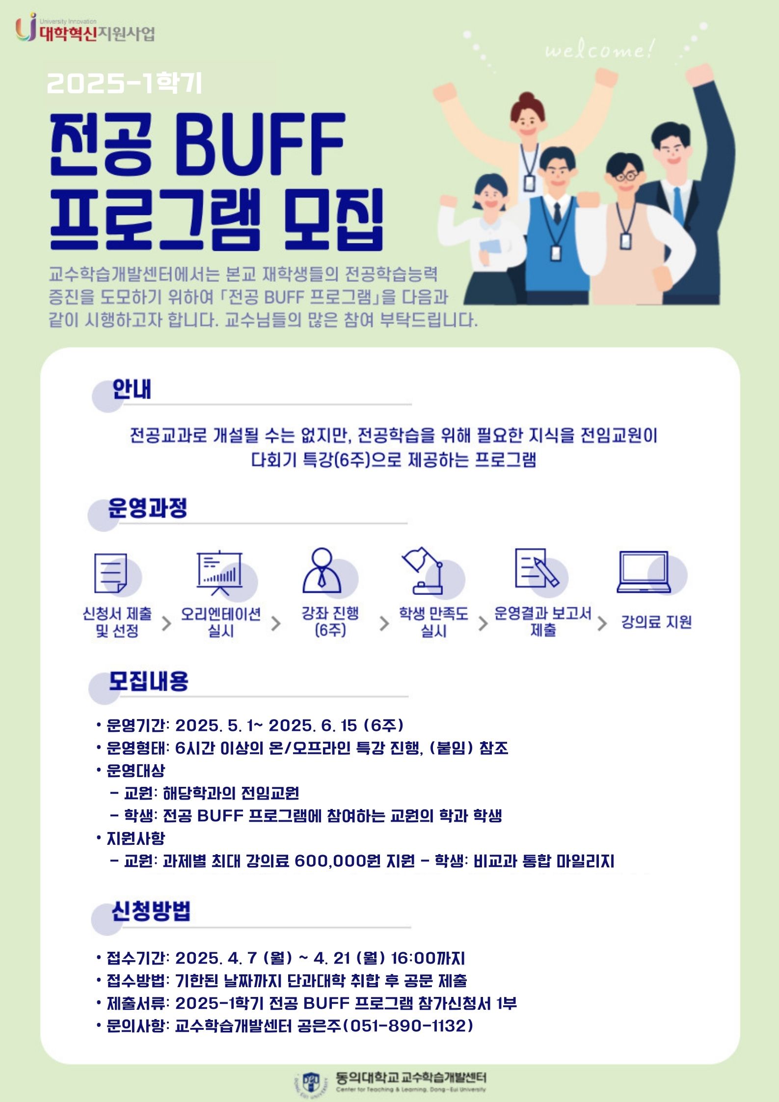 교수학습개발센터의 학습지원 프로그램인 2025-1학기 전공 BUFF 프로그램을 다음과 같이 안내하오니 신청 바랍니다.
